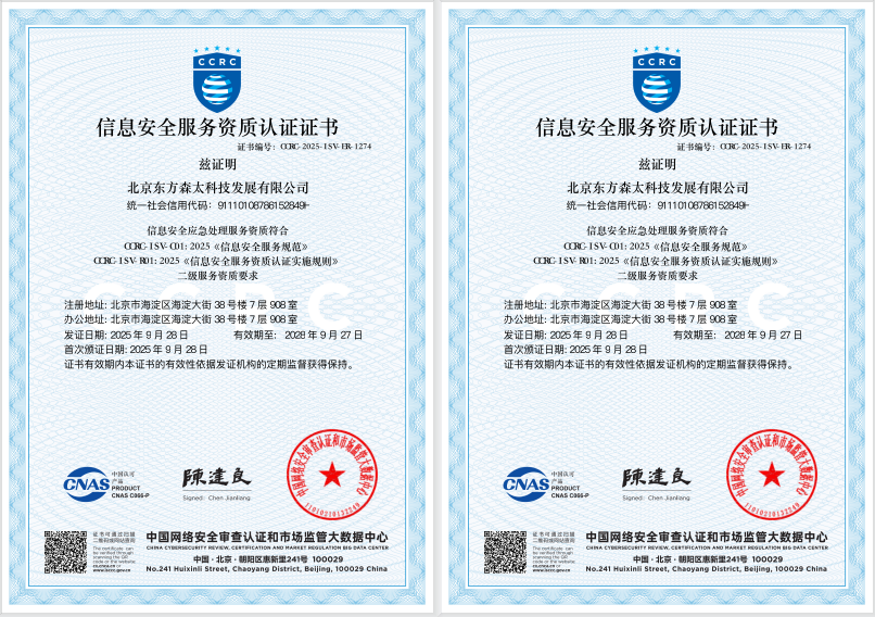 作为中国信息安全服务领域最具含金量的认证之一,CCRC评审涵盖技术实力、管理规范、服务流程、应急响应、风险识别与处置等多维度能力。此次双资质的获取,不仅印证了东方森太在突发事件应急处理与全生命周期风险评估领域的深厚积淀,更凸显了公司“可信赖、可兜底、可闭环”的一站式安全服务体系已进入国家队行列。
